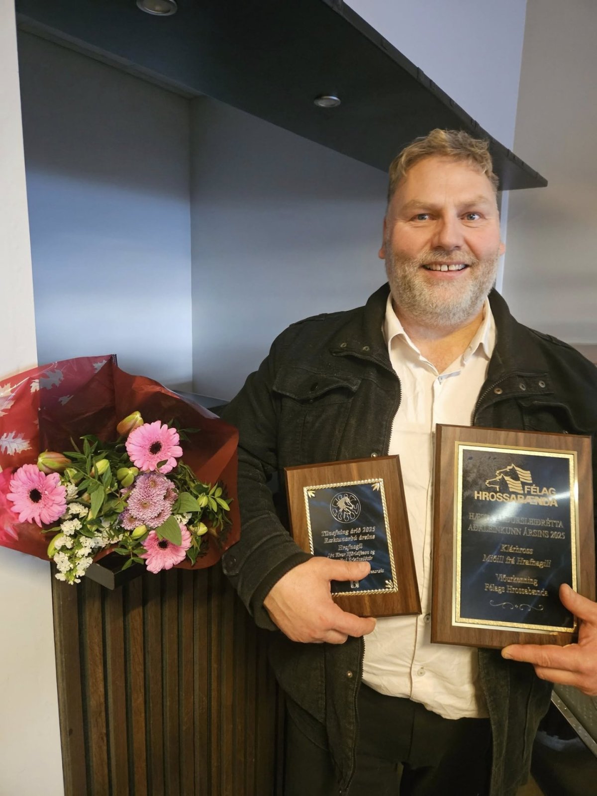 Skemmst er frá því að segja að um síðastliðna helgi, á hinni árlegu hrossaræktarráðstefnu fagráðs hrossabænda, Bændasamtaka Íslands, tók Jón Elvar á móti viðurkenningu fyrir tilnefninguna og auk þess við verðlaunum, f.h. Árna Björns Pálssonar, afreksknapa, fyrir hæstu aðaleinkunn klárhrossa 2025, en þau verðlaun hlaut hann fyrir glæsilegan árangur með stóðhestinn Miðil frá Hrafnagili sem náði 9,12 í aðaleinkunn, án skeiðs. Stóðhesturinn Miðill frá Hrafnagili er aðeins 5 vetra og er þetta afburðaárangur hjá ekki eldri gæðingi. Miðill er kominn í eigu Önju Egger-Meier en verður áfram í höndum Árna Björns. Jón Elvar er þó ekki af baki dottinn og hefur þegar dreymt fyrir framhaldinu: