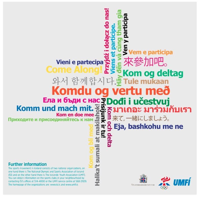 The National Olympic and Sports Association of Iceland and the Icelandic Youth Association have published a brochure in eight languages on the benefits of participating in organised sports with a sports club. The brochure is intended for parents of children of foreign origin, but research has shown that the participation rate of these children is about half of what it is for children who come from hosehoulds where Icelandic is spoken. The brochure can be accessed both in an electronic form on the association´s websites www.isi.is and www.umfi.is, and in printed form at their offices. The borchures are available in Arabic, English, Filipino, Icelandic, Lithuanian, Polish, Thai and Vietnamese.