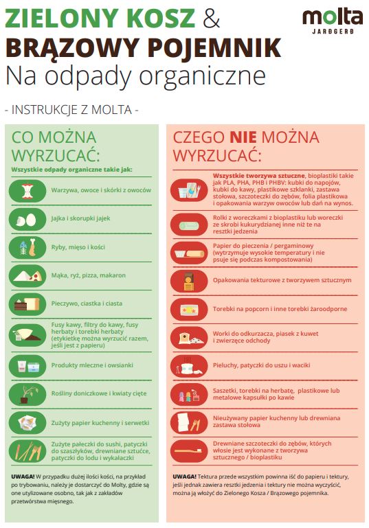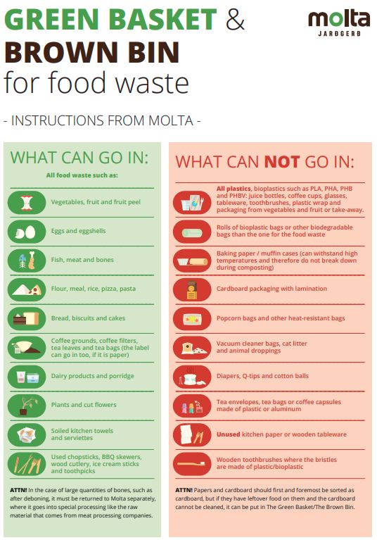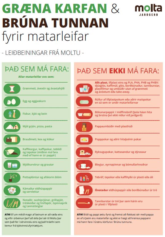 Leiðbeiningar Moltu - Græna karfan og brúna tunnan, fyrir matarleyfar.