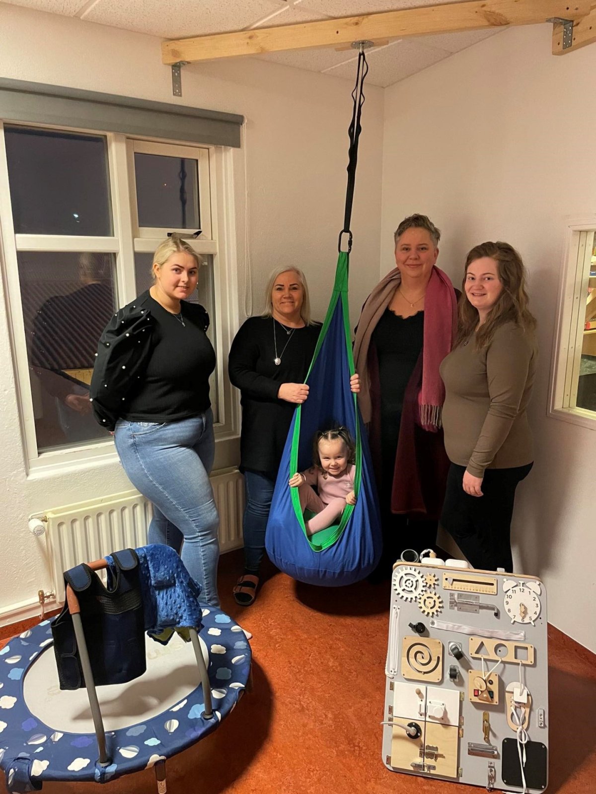 Við fengum um 110.000.- krónur og keyptum fyrir það: trampólín, skynjunarrólu, kjöltupúða með þyngingu, þrýstivesti og tvöfalt þrautabretti.