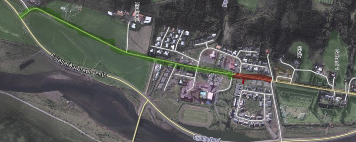 Lokunin sést betur á myndinni (rautt lokað - grænt opið) en hún nær allt frá gatnamótum við gámasvæðið og að enda nýja malbiksins auk nýju tengingarinnar í Bakkatröð.