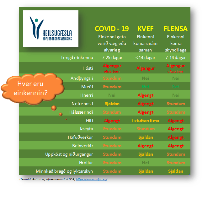 Mismunandi einkenni, COVID-19, kvefs og flensu