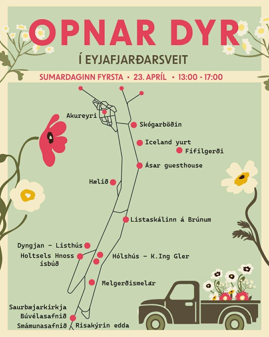 Á sumardaginn fyrsta, fimmtudaginn 23. apríl, milli kl. 13 og 17 ætlum við að opna dyrnar upp á gátt og bjóða vörur okkar og þjónustu. Við leggjum mikinn metnað í það sem við bjóðum upp á og fjölbreytnin er gríðarleg. Skellið ykkur á rúntinn í Eyjafjarðarsveit og kynnið ykkur málið.