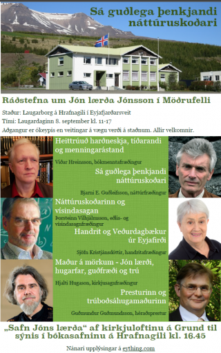 Ráðstefna um efni sem skiptir máli úr fortíðinni fyrir framtíðina. Kastljósinu verður beint að Jóni Jónssyni (1759-1846), presti í Grundarþingum, fróðum manni með vakandi huga fyrir náttúru og samfélagi, en einnig menningu og trúarbrögðum á hans tímum. Í Grundarkirkju var bókasafn á kirkjuloftinu frá Jóni síðan 1839 sem nú hefur verið skráð og verður opnuð sýning á því í lok ráðstefnunnar á bókasafninu á Hrafnagili. Þá verður einnig greint frá handritum sem Jón yngri eða lærði, sem urðu viðurnefni hans, skrifaði. Þar á meðal eru veðurdagbækur sem faðir hans Jón Jónsson eldri byrjaði á og Jón yngri hélt áfram með og spanna nær 100 ár. Náttúruleg guðfræði var stunduð á þessum árum þar sem sköpunarverkið var skoðað til að skilja Guð og veröldina (það var fyrir daga Darwins). Spurt verður: Geta vísindi liðins tíma lagt eitthvað til málanna? Jón þýddi bók Shums nokkurs sem ber heitið Sá guðlega þenkjandi náttúrskoðari, sem fær sérstaka athygli á ráðstefnunni. Jón lærði hefur orðið að bókmenntapersónu og sögur af honum hafa vakið athygli. Þær eru nokkuð mótsagnakenndar svo spurt er um hans heittrúuðu harðneskju, en einnig gamansemi, staðfestu og þjónustulund. Leitast er við að varpa ljósi á staðbundna sögu og menningu í Eyjafirði og setja í samhengi þegar lútherskur réttrúnaður mætti upplýsingastefnunni og skynsemishyggju. Þá var Jón í sambandi við menn erlendis þar sem kirkjur mótmælenda voru að hefja umtalsvert trúboð sem gerði þær að alþjóðlegri hreyfingu. Verða kynntar til sögunnar heimildir um það og sagt frá þátttöku Jóns varðandi það hugðarefni sitt.