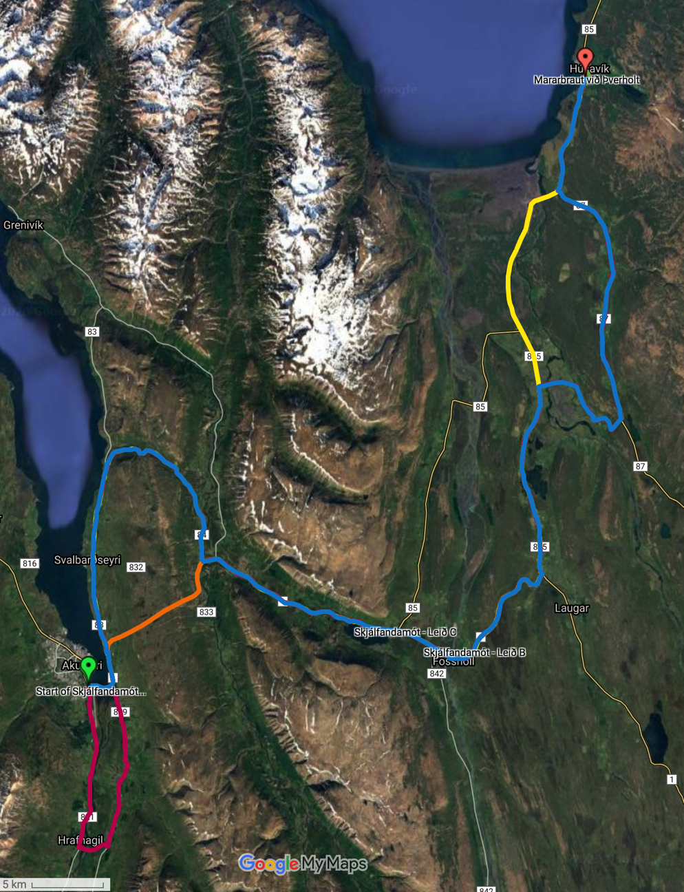 Ræst verður frá Akureyri kl. 9:00 og mun allt að 30 manna hópur hjóla frá Akureyri um Miðbraut hjá Hrafnagili og norður í Vaðlaheiðargöng. Keppnisleiðin endar á Húsavík og er áætlað að henni ljúki um kl. 14:00 en hér má sjá kortmynd sem sýnir ágætlega hvar leiðirnar liggja.