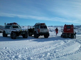 yfir 3200 km þessa daga. Auk okkar tækja höfum við fengið að láni breyttan jeppa, tvo snjósleða, kerrur og síðan fengum við mikla