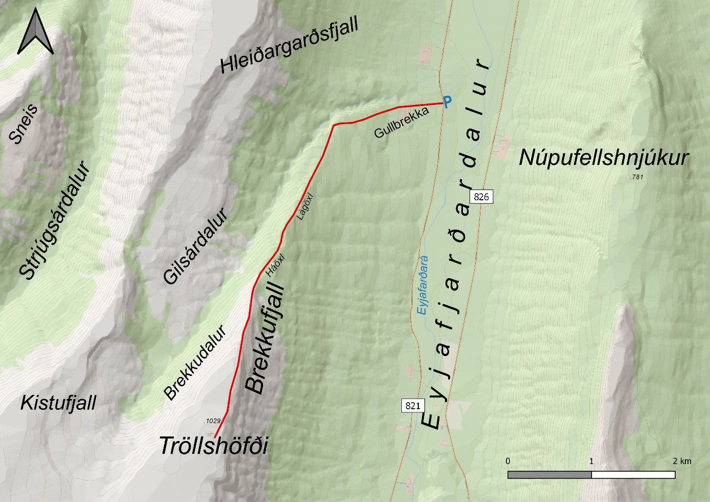 Brekkufjall stendur fyrir ofan bæinn Gullbrekku í Eyjafjarðarsveit. Gengið er upp heimreiðina og að fjallsgirðingu. Best er síðan að halda sig á kindagötum nálægt gilinu þangað til það tekur að beygja suður. Síðan er gengið upp á topp, hverja öxlina á fætur annarri. Gangan getur verið krefjandi þegar ofar er komið. Þar tekur við brött uppganga á fjallsegginni og er gott að notast við göngustafi á þessum kafla. Þegar upp er komið úr mesta brattanum er gengið ofan á fjallinu að hæsta punkt sem heitir Tröllshöfði og hann er í 1037 m hæð. Útsýnið út Eyjafjarðardal er undurfagurt úr þessari hæð.
