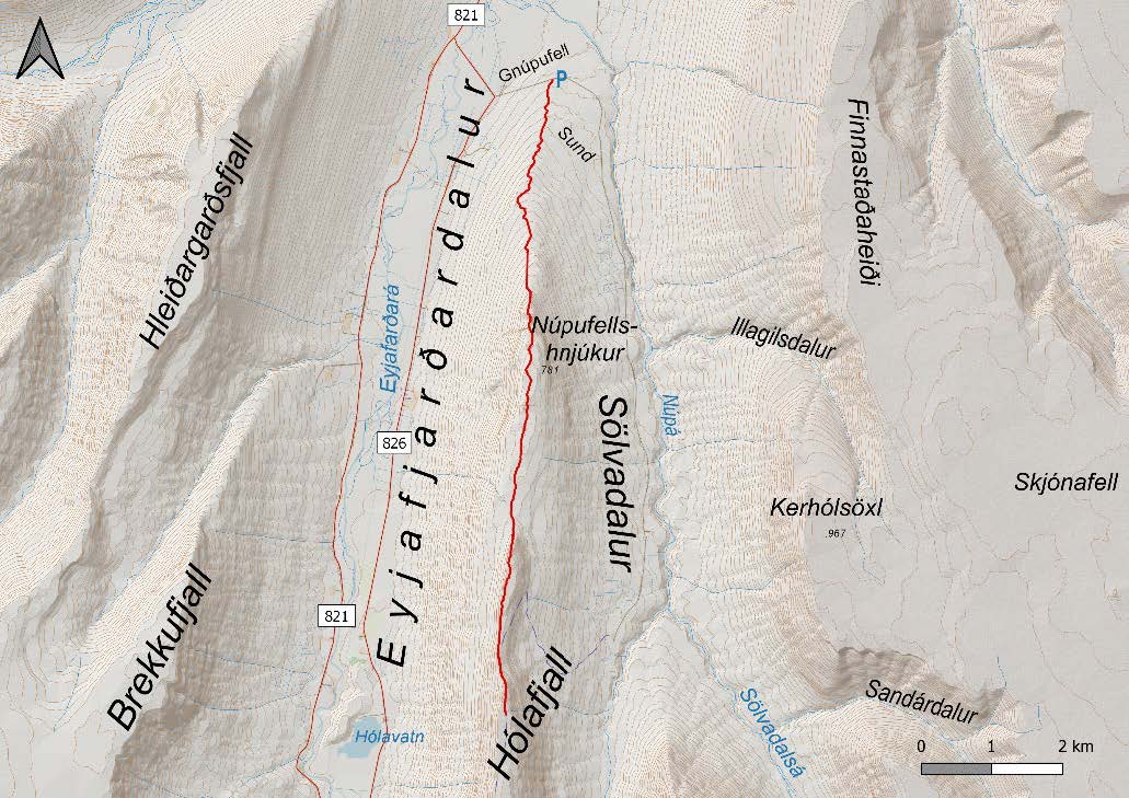 Uppgöngustaður: Á hæðinni austan við Gnúpufell.