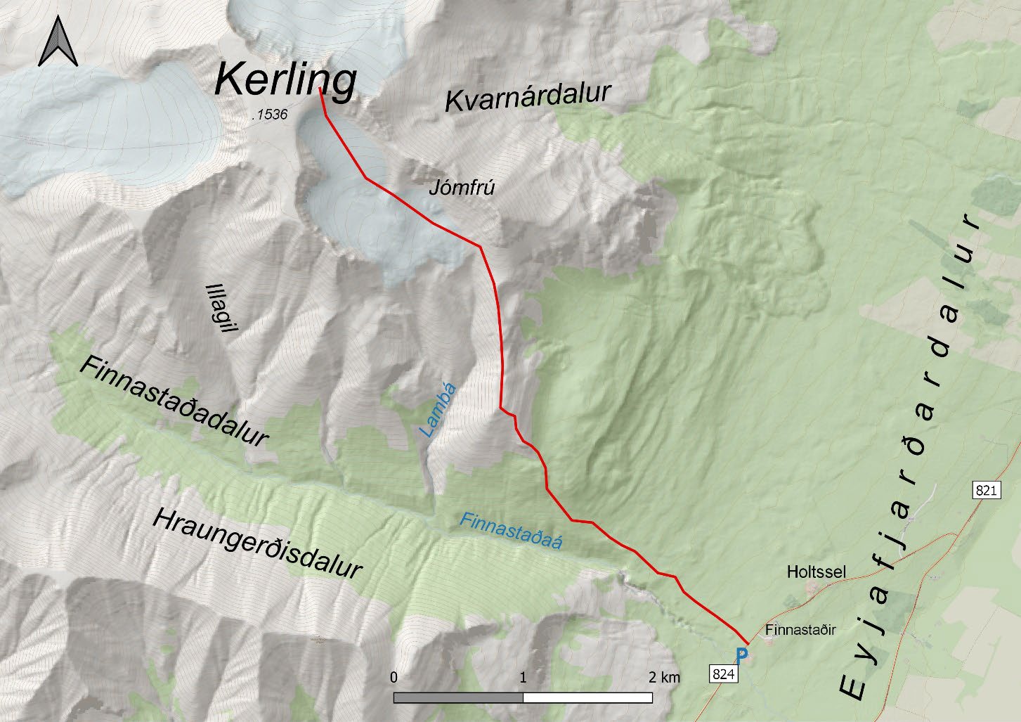 Lagt er af stað frá Finnastöðum í Eyjafjarðarsveit rétt norðan við Finnastaðaá og gengið með fram henni áleiðis upp eftir og beygt í norður að jöklinum þegar Lambá nálgast. Farið yfir jökulinn á öruggum stað, en það getur verið breytilegt milli ára hvar best er að fara. Útsýnið frá Kerlingu er engu líkt og sérstaklega á góðviðrisdögum þegar sólin er hátt á lofti. Í góðu skyggni sést alla leið til Herðubreiðar.