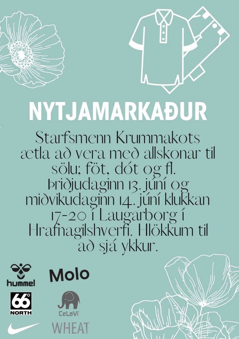 Starfsmenn Krummakots ætla að vera með allskonar til sölu; föt, dót og fl. þriðjudaginn 13. júní og miðvikudaginn 14. júní klukkan 17-20 í Laugarborg í Hrafnagilshverfi. Hlökkum til að sjá ykkur.