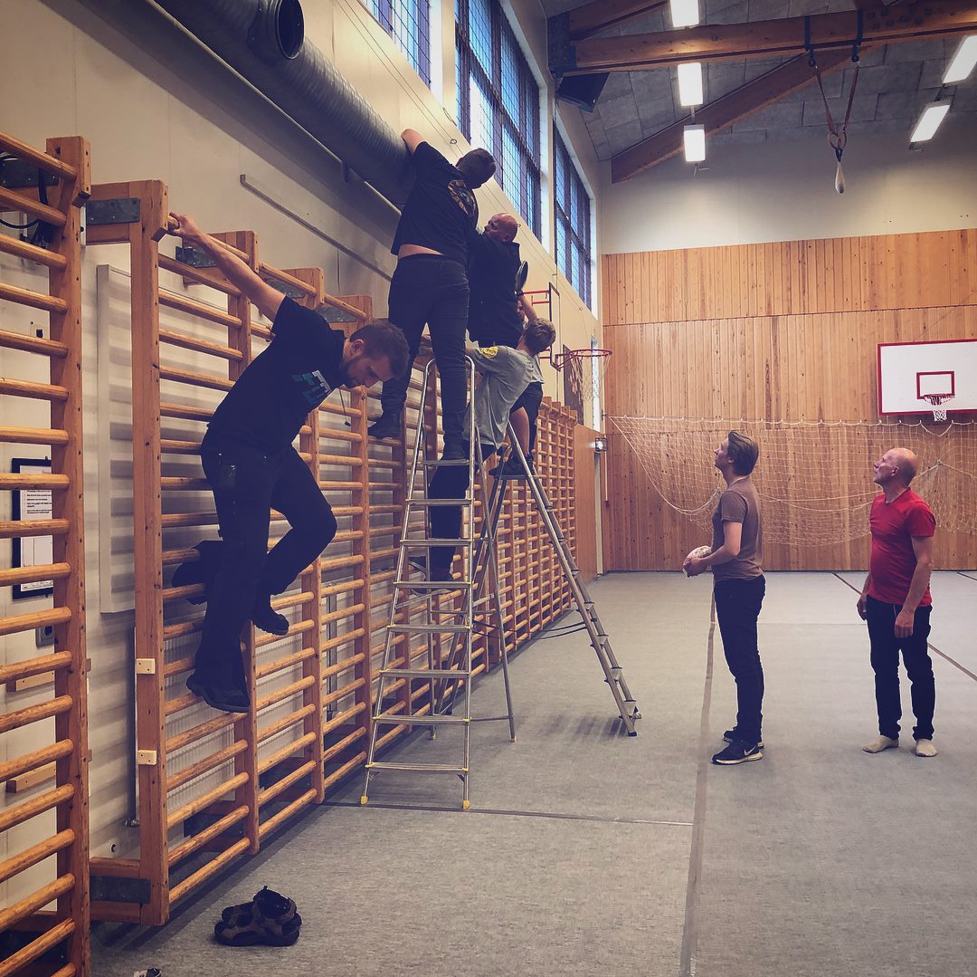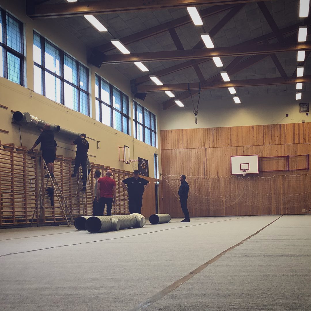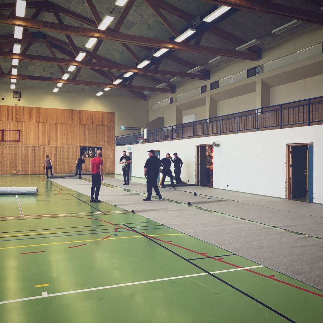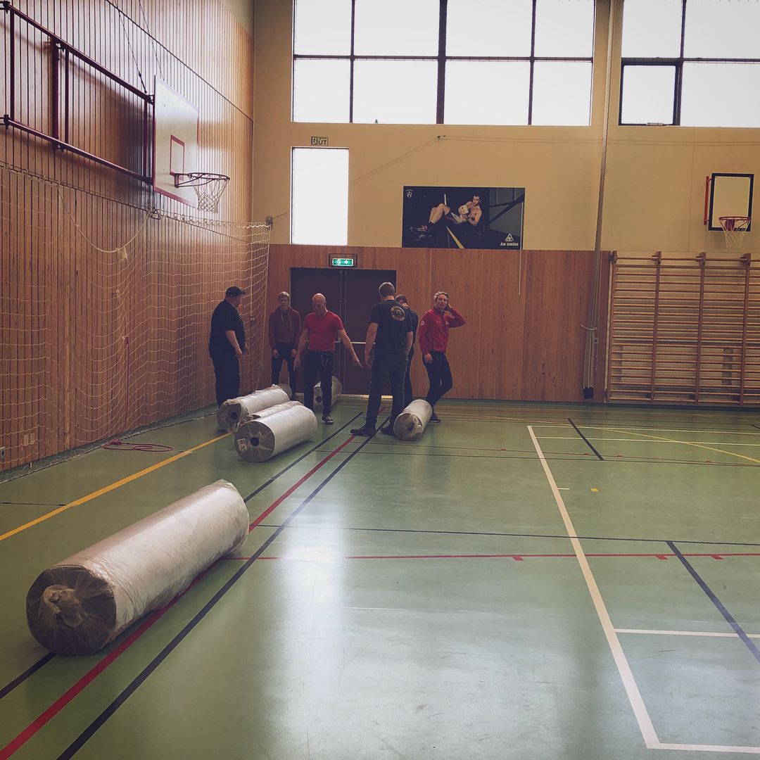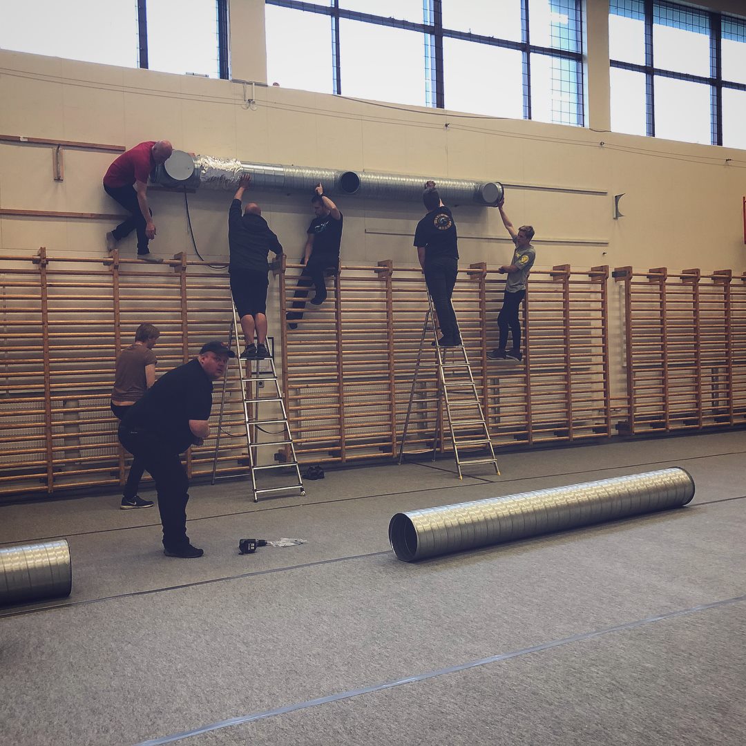 Nú er allt að gerast, í gærkvöldi byrjaði uppsetning Handverkshátíðarinnar 2018. En þá mættu til leiks galvaskir drengir frá björgunarsveitinni Dalbjörg og húsverðirnir okkar og skelltu nýja teppinu á íþrótta salinn og hengdu upp auka loftræstikerfi svo sýnendur og gestir hafi það sem allra best meðan þeir rölta um salinn hjá okkur í sumar. Við þökkum strákunum kærlega fyrir vel unnið verk.