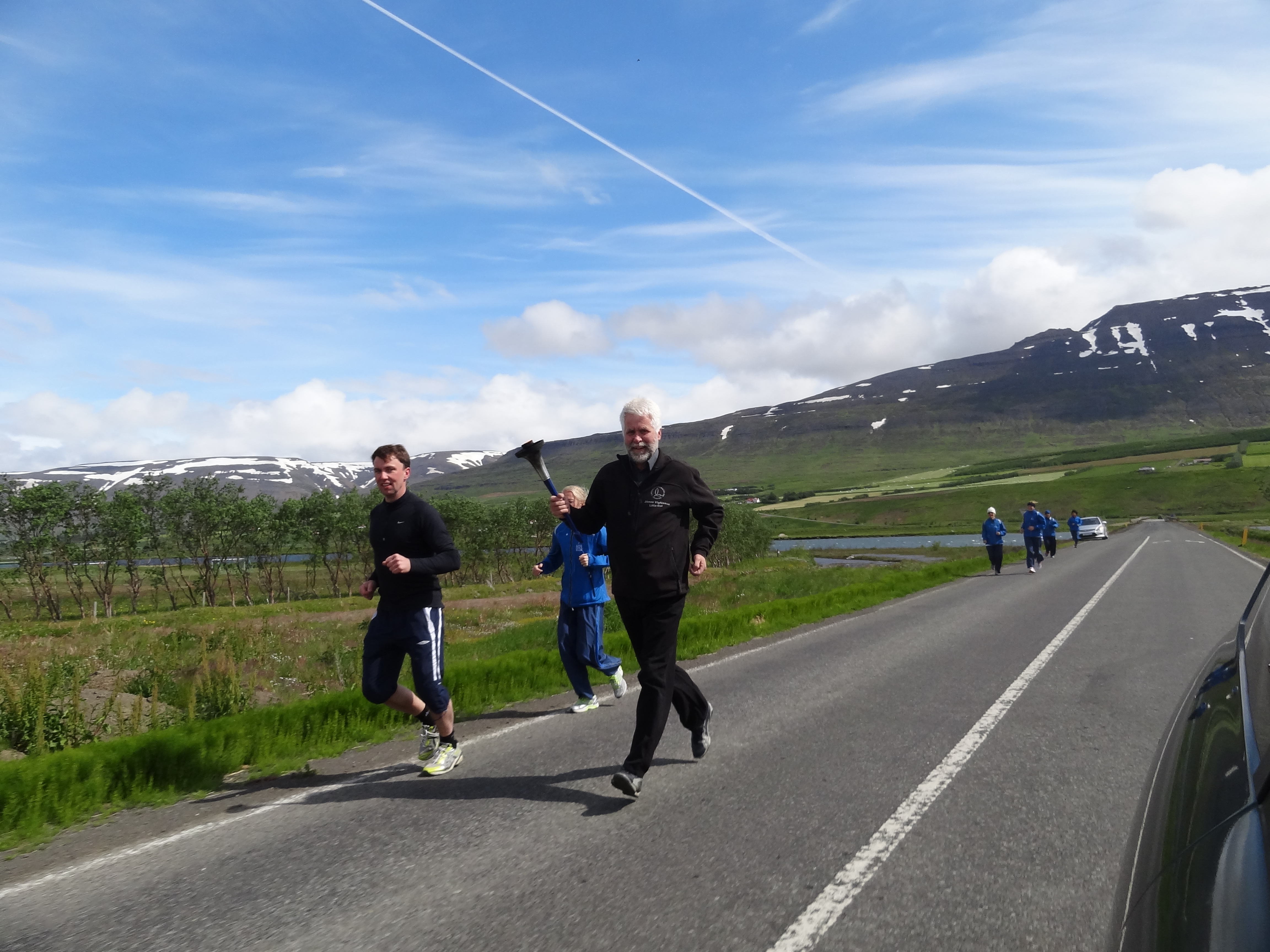 Alþjóðlegur hópur hlaupara kom færandi hendi með logandi Friðarkyndil úr Svalbarðsstrandarhreppi og síðan lá leiðin til Akureyrar.