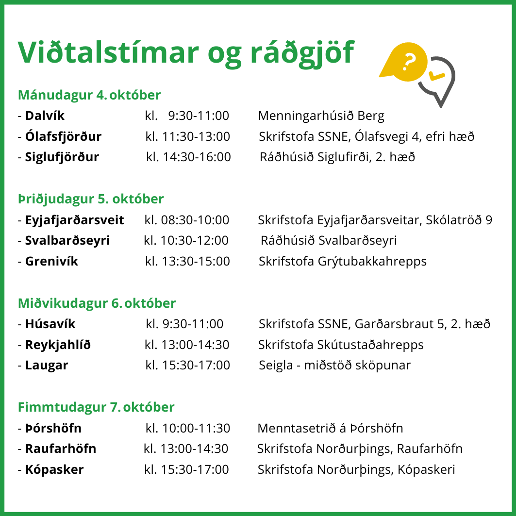 Hér fyrir neðan má sjá tímaáætlun ráðgjafa SSNE en fyrir utan þessa auglýstu tíma er auðsótt að leita til starfsfólks SSNE