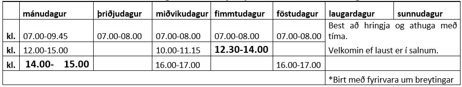 Eftirfarandi tímar eru lausir ykkur til afnota í Íþróttamiðstöð Eyjafjarðarsveitar. Feitletraðir tímar eru sérstaklega fráteknir fyrir ykkur en hinir eru einnig í boði.