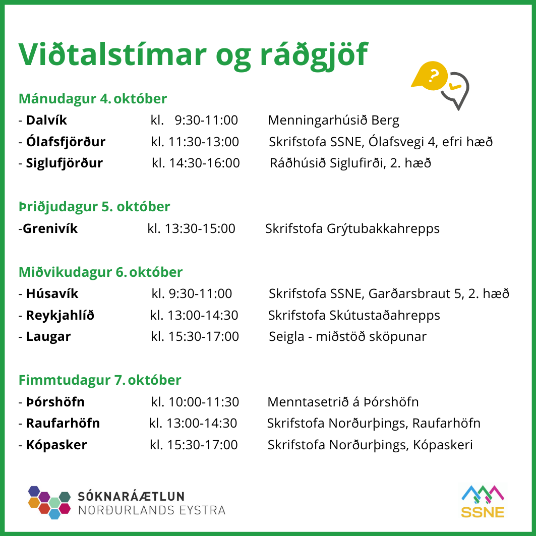Opnað verður fyrir umsóknir í Uppbyggingarsjóð Norðurlands eystra þann 4. október og af því tilefni verða ráðgjafar frá SSNE, Samtökum sveitarfélaga og atvinnuþróunar á Norðurlandi eystra, á ferð um landshlutann vikuna 4. - 7. október til að veita persónulega ráðgjöf um næstu skref. Skráning fer fram hér en ráðgjöfin er ykkur að kostnaðarlausu.