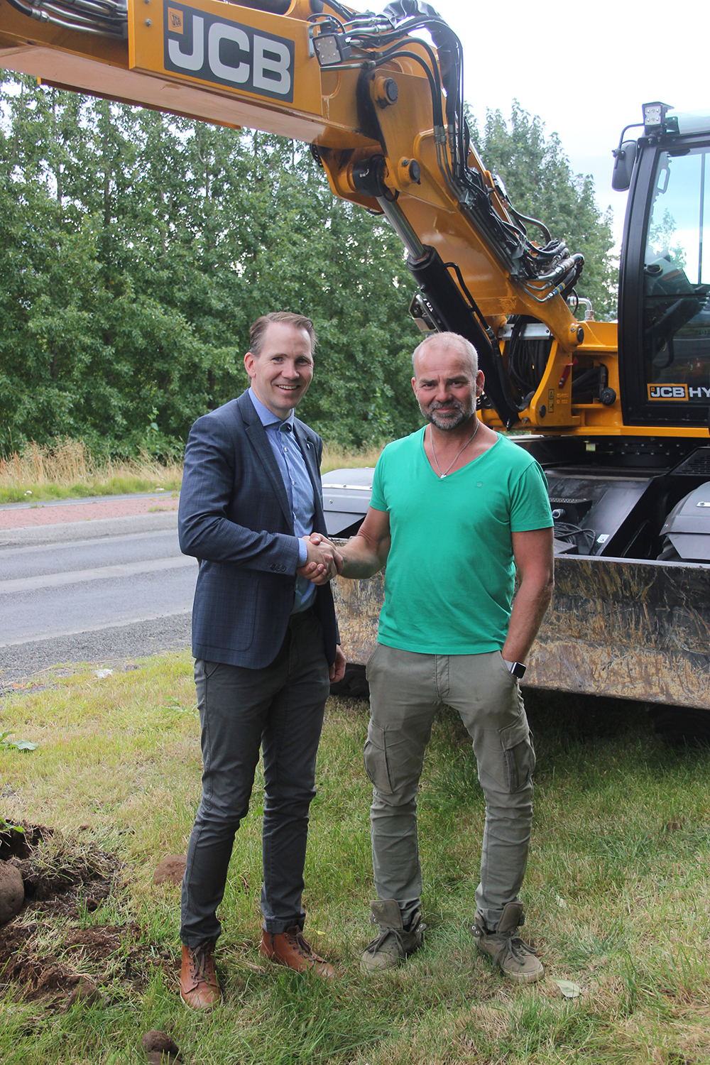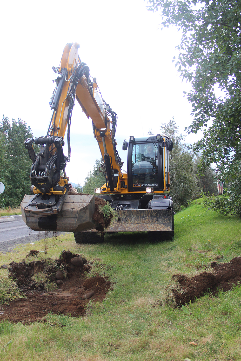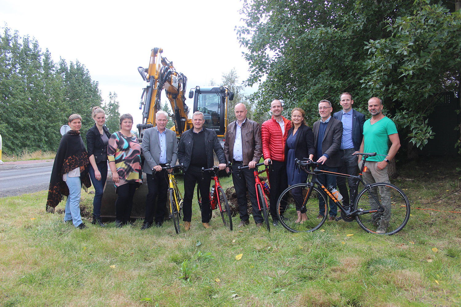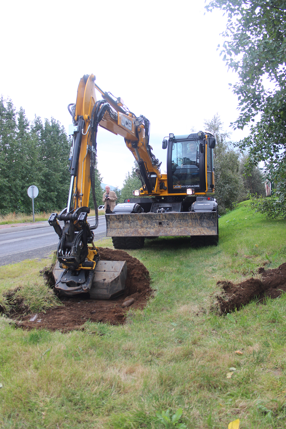 Samgönguráðherra ræsti gröfu undir leiðsögn frá Finni Aðalbjörnssyni, en tók að því loknu fyrstu skóflustungu að hjóla- og göngustígnum.